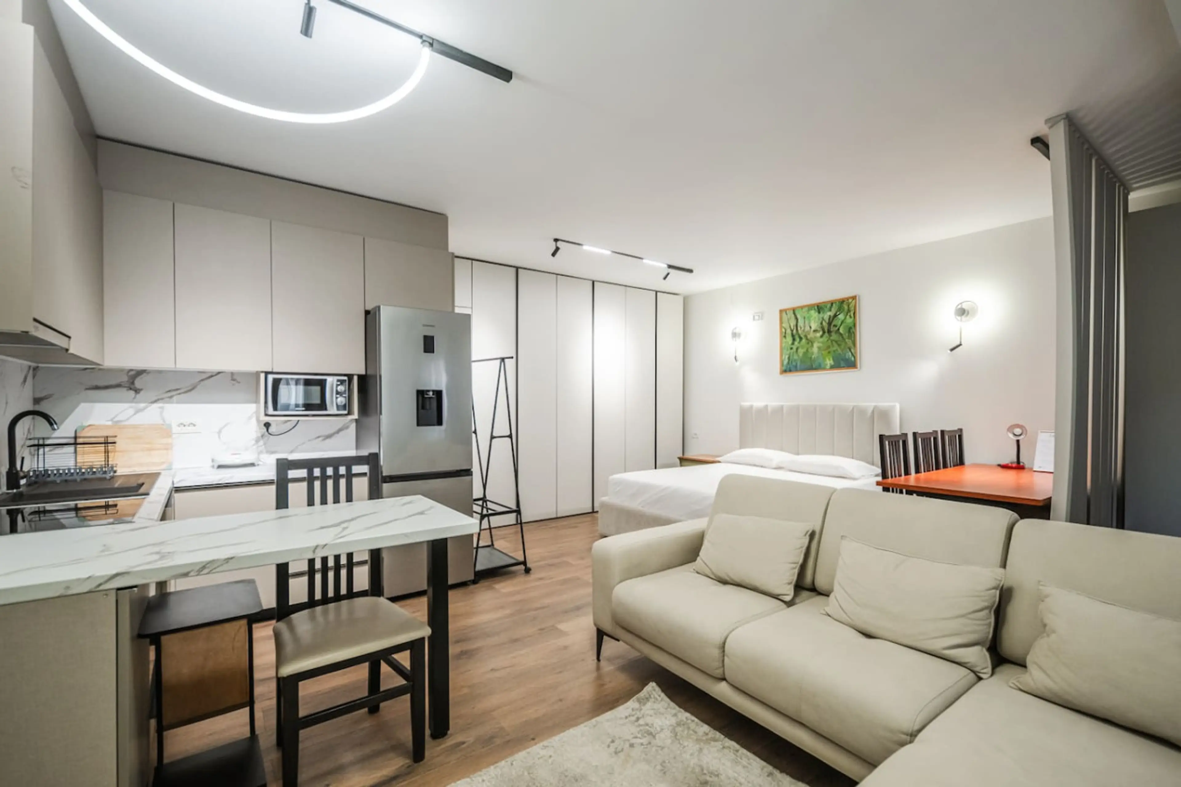 Welcome to City Vibes Studio | Tirana Center by PikHost! Modern studio apartment in Tirana, Myslym Shyri, ideal for up to 3 guests. Newly renovated and designed for comfort, it features a full kitchen, air conditioning, smart TV, Wi-Fi, and a dining area. The simple decor and practical layout make ...